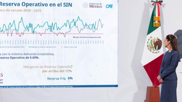 "Lo que se llama el Margen de Reserva —que es la cantidad de plantas que están en reserva por si sube la demanda— creció de 2024 a 2025 de 6 a 10 por ciento. ¿Por qué ocurrió eso?, pues por una mejor planeación, junto con el Cenace (Centro Nacional de Control de Energía), de qué plantas entran, cuáles van a mantenimiento, etcétera. Segundo, porque hay dos nuevas plantas de generación en el país que fueron programadas desde el gobierno del Presidente López Obrador y que ya inauguramos, eso es lo segundo; lo tercero, las nuevas plantas de generación solamente para 2025 a 2026.