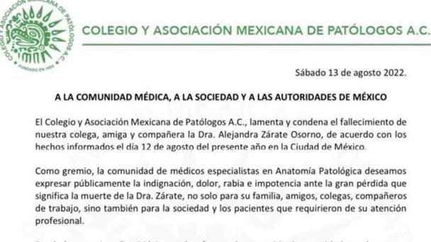 Tras el asesinato de la médica patóloga Alejandra Zárate Osorno, el Colegio y Asociación Mexicana de Patólogos exigió al Gobierno condiciones adecuadas de seguridad para los médicos y que el caso no quede impune