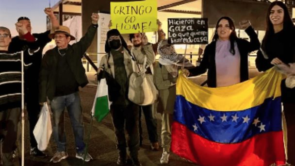Durante el recorrido, los participantes portaron pancartas y banderas de Venezuela y Palestina, además de corear consignas contra lo que calificaron como una "injerencia imperialista" en la región.