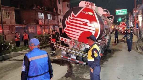 El socavón provocó que la pipa quedara atascada, aunque no se registraron personas lesionadas ni fuga del combustible. Al sitio acudieron elementos de la Secretaría de Seguridad Ciudadana.