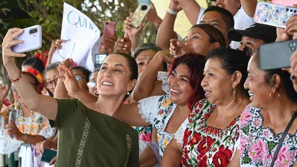 Con la ya clásica selfie se aprecia a la presidenta Claudia Sheinbaum Pardo con un grupo de mujeres que la recibieron con todo cariño en su estancia en Quintana Roo