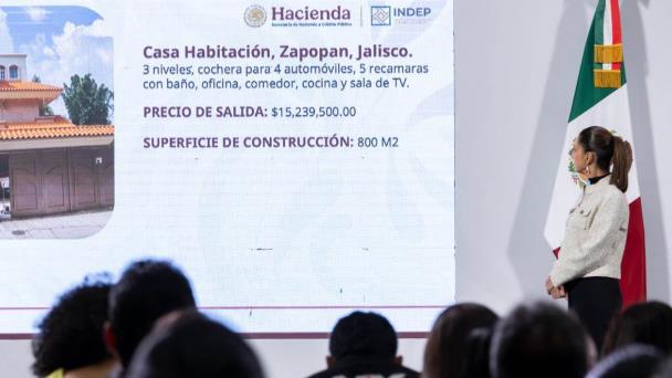 La Presidenta Claudia Sheinbaum ve la gráfica de los inmuebles que serán subastados.