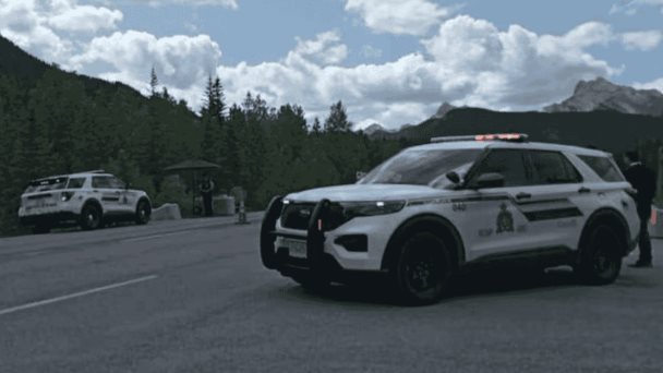 Elementos de la Real Policía Montada de Canadá resguardan la entrada al pueblo de Kananaskis, sede de la Cumbre del G7, la cual arrancó este domingo y a la cual llegará mañana lunes la presidenta Claudia Sheinbaum Pardo.