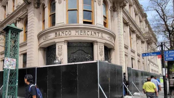 El edificio del Banco Mercantil de Monterrey, considerado patrimonio arquitectónico e histórico de la Ciudad, fue protegido con vallas antimotines previo a la Marcha del 8M.
