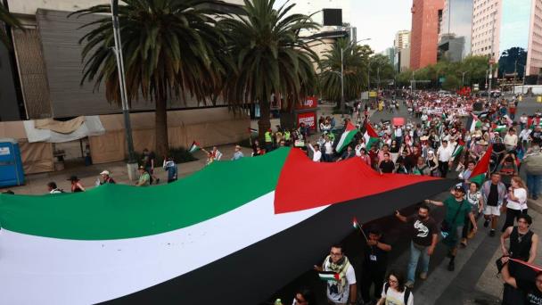 Maestros de la CNTE se sumaron ayer a la marcha propalestina en la Ciudad de México y demandaron a la presidenta Claudia Sheinbaum romper relaciones con Israel.