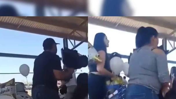Algunas personas, cargando sus ramos de flores y globos buscan retirarse del lugar y otras, madres, abrazan a menores de edad para resguardarse.