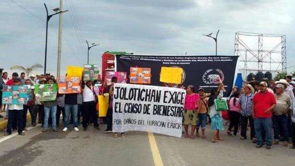 "Jolochitán exige el censo de Bienestar por daños del huracán Erick", se lee en una manta que portan los inconformes apostados desde las 7:00 horas en la carretera.