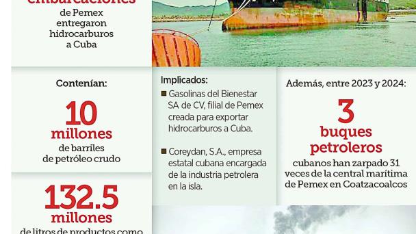 Los registros de plataformas de comercio exterior -como Veritrade- muestran que entre el 29 de mayo y el 27 de junio de 2025 se registró ante aduanas el envío a Cuba de 10 millones 230 barriles de petróleo crudo y 132.5 millones de litros de productos identificados como turbosina, aceite diésel y gasolina regular. Estas operaciones se realizaron a través de Gasolinas del Bienestar SA de CV, filial de Pemex creada para exportar hidrocarburos a la isla.