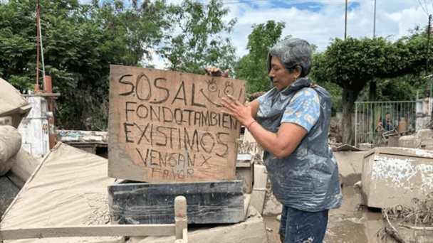 "Queremos que vengan, que vean cómo estamos. No pedimos mucho, solo agua limpia, comida y que no se olviden de nosotros", insistió, mirando su cartel, que resiste colgado entre el lodo.