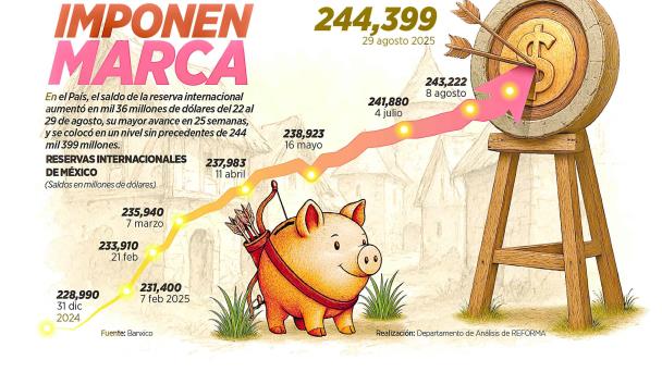 En la semana que terminó el 29 de agosto de 2025, el saldo de la reserva internacional alcanzó un máximo histórico por 244 mil 399 millones de dólares, de acuerdo con información del Banco de México (Banxico).