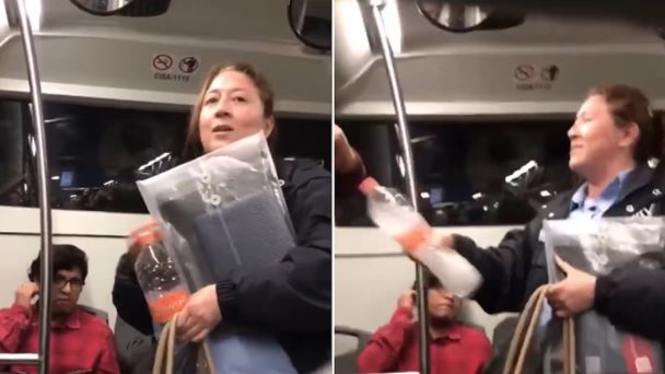 En el clip que apenas dura unos segundos, se observa a la agresora golpear con una botella de agua al joven que interpone su brazo para esquivar el daño. "¡Quítate!... el que está mal eres tú. Si nos está molestando tu herpes en los ojos ¿por qué no te largas?", reclamaba la mujer.