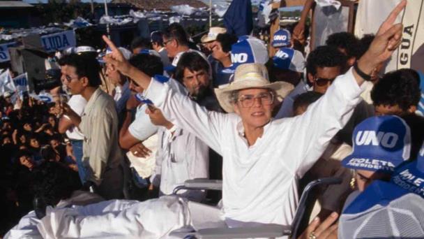 En mayo de 1989 se conformó la Unión Nacional Opositora (ONU), organización política conformada por 14 partidos que pretendía derrocar electoralmente al sandinismo. Violeta Chamorro fue nombrada candidata de la coalición y se enfrentó a Ortega en las elecciones convocadas para febrero del siguiente año. Con un discurso de paz y reconciliación, Chamorro ganó contra todo pronóstico esas elecciones supervigiladas. "Me han votado porque tienen fe en un cambio profundo después de 50 años de somocismo y 10 de sandinismo. Y yo acepto ese voto, consciente de mi responsabilidad", dijo entonces Chamorro en una en EL PAÍS con Miguel Ángel Bastenier. Aquel triunfo quedó registrado en la portada de su diario, La Prensa, con el siguiente titular: "Voto, Violeta, Victoria".