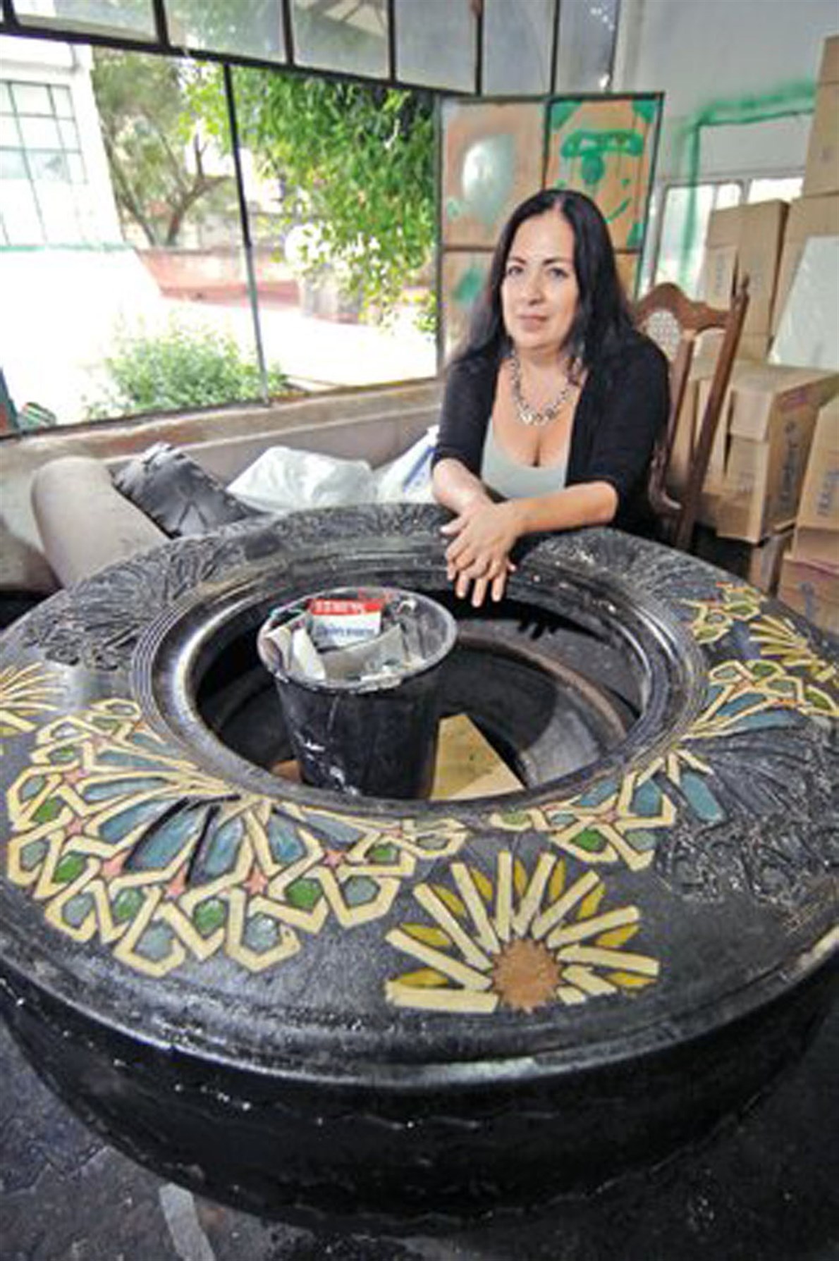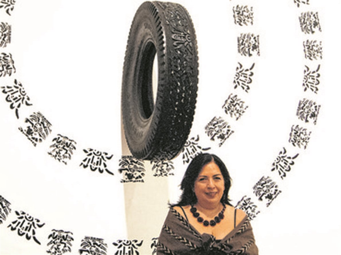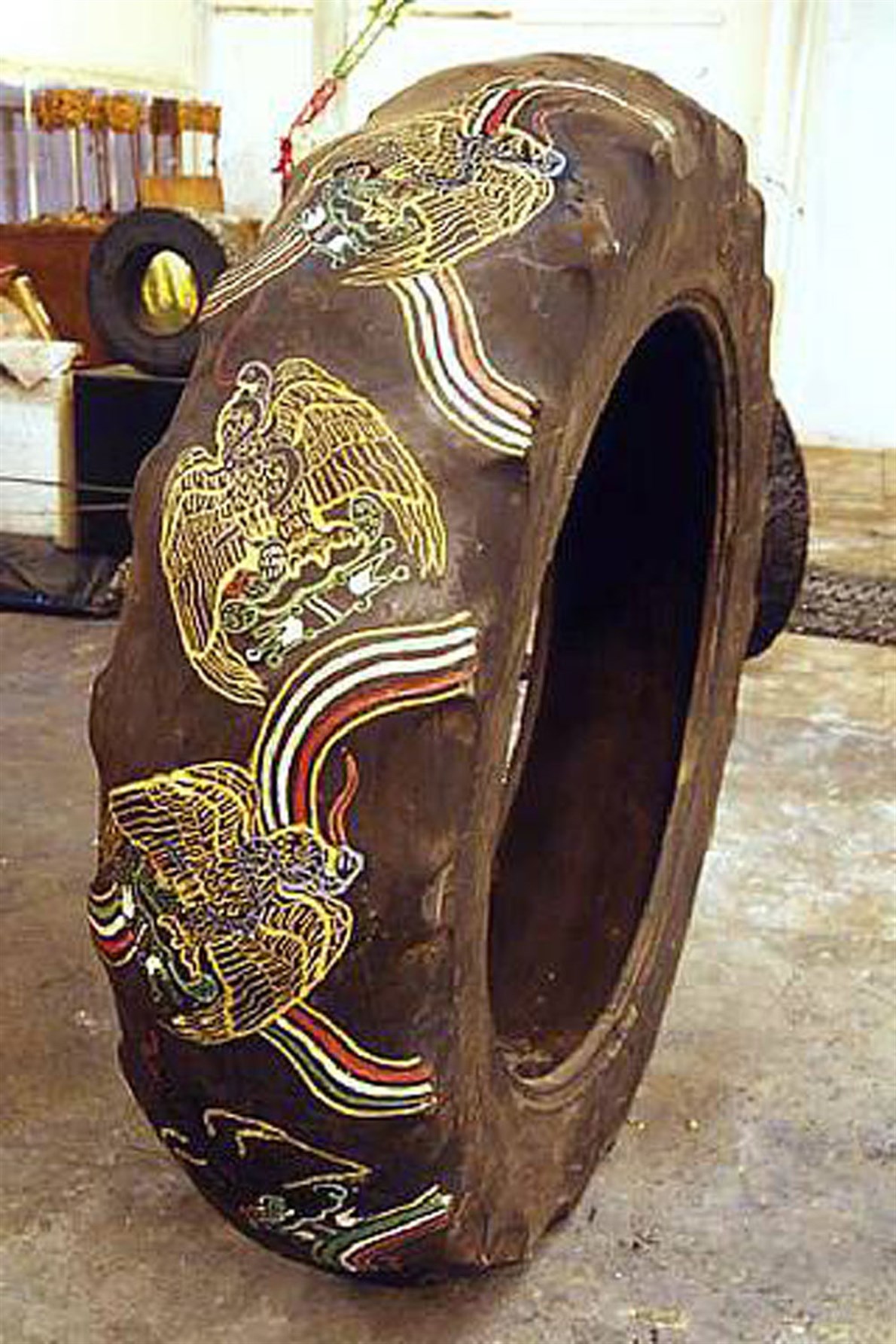 “En sus obras destacan llantas con estelas de motivos prehispánicos, intervenidas con hoja de oro y chicles masticados de colores intensos y únicos, carros y camioncitos de madera pintados o vestidos que los resignifican, papel picado y pintura sobre muros que exploran la relación entre el color y la sombra”, comentó.