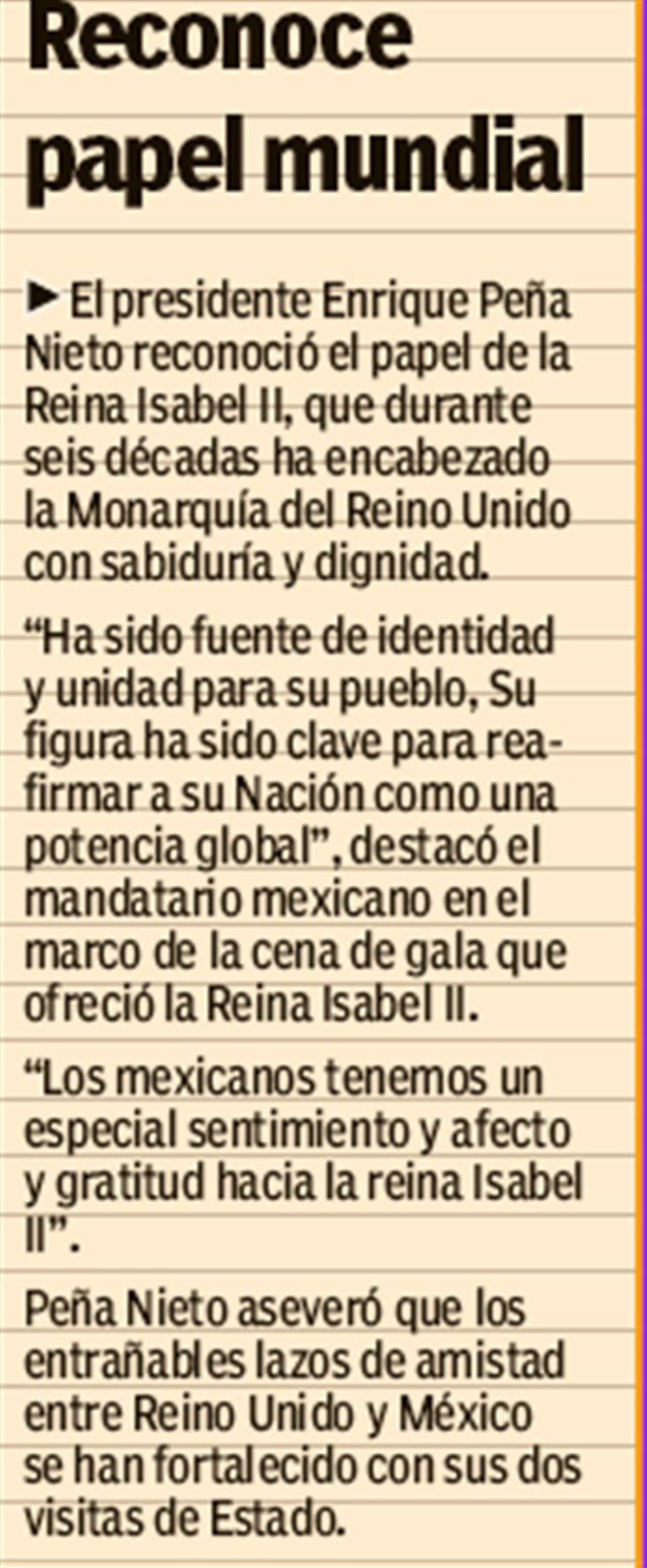 “Las reformas económicas que ha impulsado en la economía mexicana han sido audaces e impresionantes y el Reino Unido está listo para trabajar junto con México en la implementación de dichas reformas, fortaleciendo los fundamentos de nuestra asociación, en el interés de la prosperidad de ambas sociedades”, dijo la monarca.