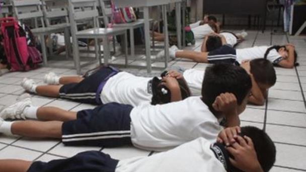 SEGURIDAD. Los menores practican posiciones para protegerse ante una posible balacera.