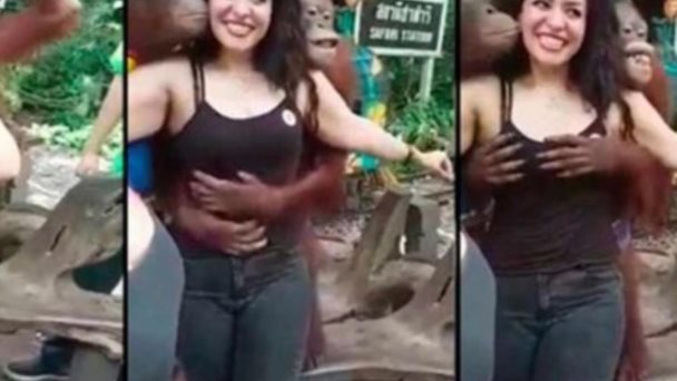 El hecho sucedió en un zoológico en Tailandia, una turista se acercaba a una atracción donde dos orangutanes posan para sacarse fotografías, todo marchaba bien hasta que un orangután se alborotó al ver tal belleza que no pudo contener sus ganas de apretar sus "bubis", el momento fue captado por las cámaras, la mujer se mostró tranquila en todo momento, tal vez por que se trataba de 'animales' la experiencia quedará como un gracioso recuerdo para la bella mujer.