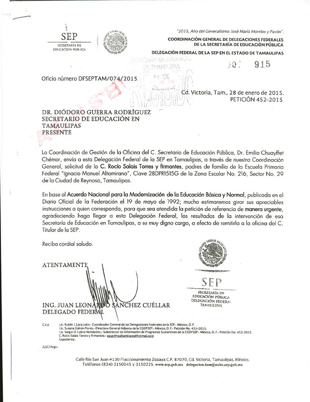 Ante esa falta de interés por parte de los funcionarios del CREDE, la actual presidenta de la mesa directiva Rocío Torres Salais expuso que el 30 de octubre enviaron un oficio a la Secretaría de Educación en Tamaulipas. Fue confirmada su recepción hasta el 4 de noviembre.