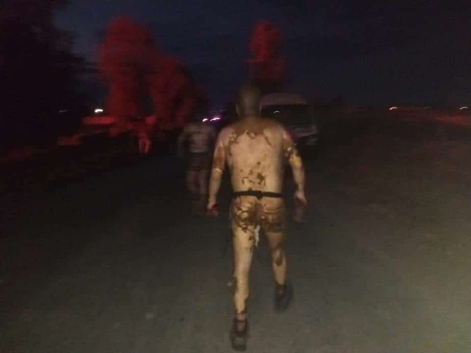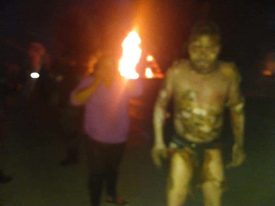 Posteriormente las tomas mostraron llamaradas de gran altura en la noche. Gente gritando huía de las llamas, algunos quemándose y agitando los brazos.