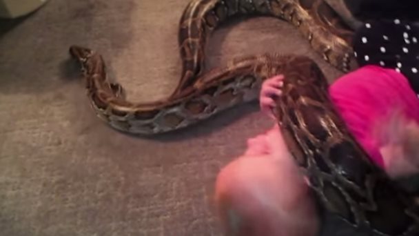 Sin embargo, Jamie Guarino, originario de Michigan, grabó a su bebé jugando con la mascota de la familia, una serpiente pitón de 4 metros de largo.