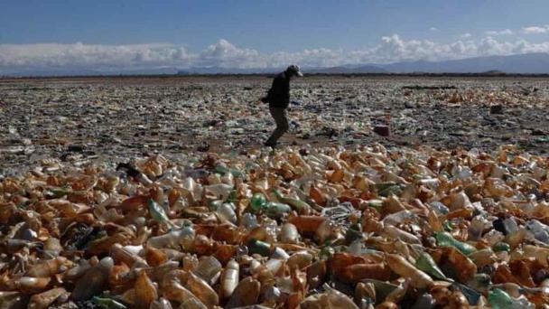 Decenas de botellas de plástico, zapatos y bolsas llenan una parte del lago Uru Uru