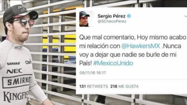 El piloto mexicano Sergio Pérez, de la escudería Force India, terminaría de tajo su relación con un patrocinador que expresó burlas hacia los mexicanos tras las elecciones presidenciales de Estados Unidos.