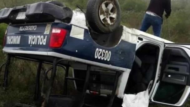 Un oficial de la Policía de Cadereyta resultó lesionado luego de perder el control de su patrulla y terminar volcándola al salir del camino.
