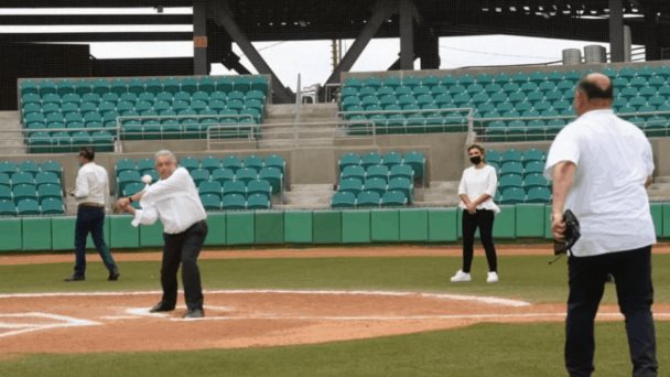 Fue hasta el segundo turno al bat que el Ejecutivo federal pudo conectar la bola, lanzada por el presidente municipal Santo González (Morena) -quien fungió como pitcher- esto al finalizar la reinauguración del estadio de San Luis Río Colorado, y a 40 grados de temperatura.