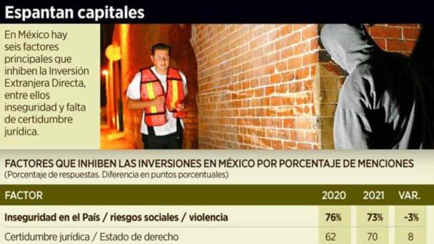 La percepción de inseguridad en el País sigue siendo el factor más relevante que inhibe las inversiones extranjeras, aunque se considera muy focalizada en ciertas regiones como es el Bajío, se lee en el documento. Un 73 por ciento de los encuestados mencionó este factor como freno para la inversión extranjera directa, colocándolo como el principal obstáculo en México.