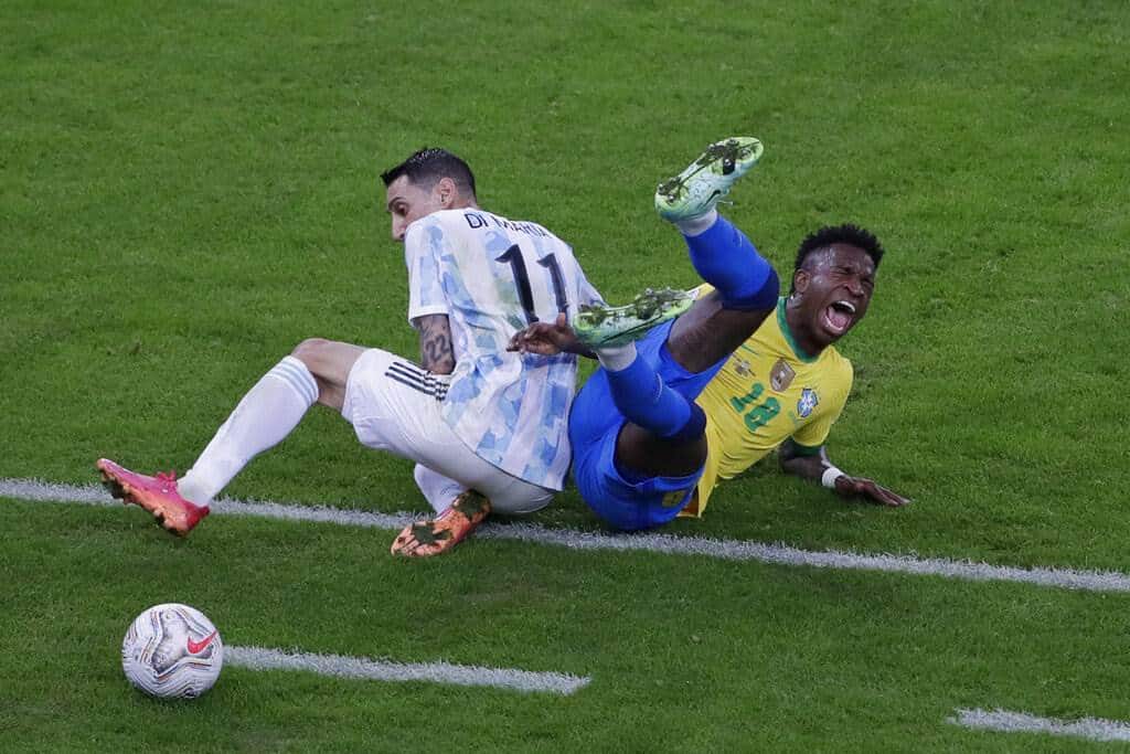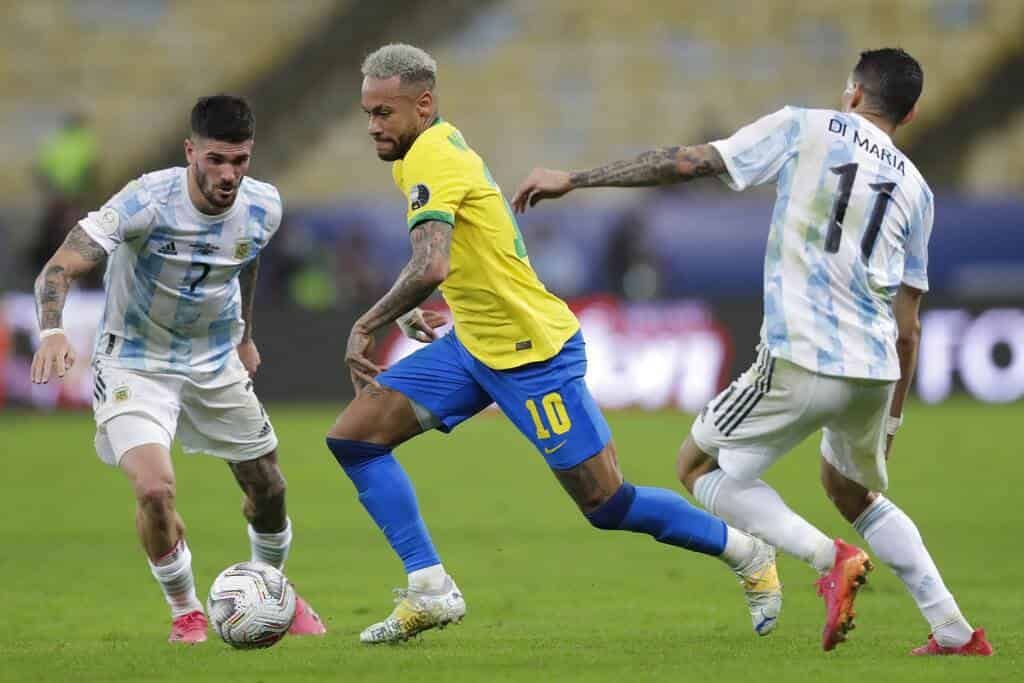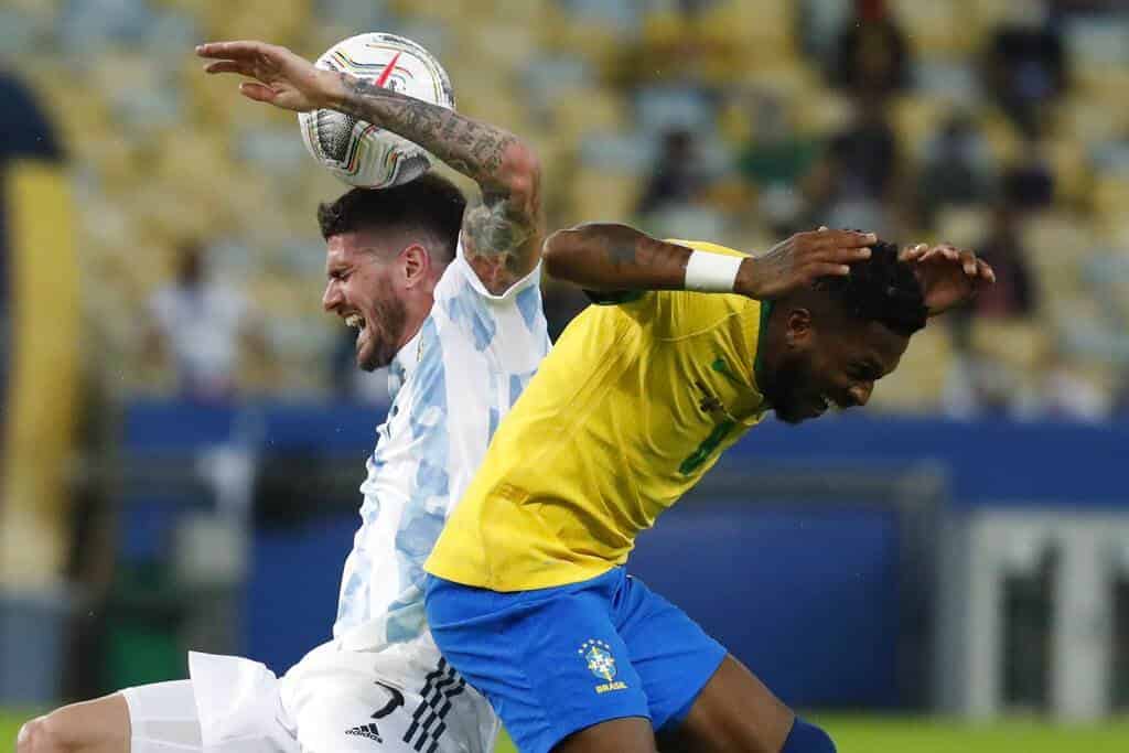 Argentina, que nuca había llegado a un duelo por el título de la Copa América cuando este se definía en tierras brasileñas, se sacudió de casi 30 años de fracasos con una genialidad de Rodrigo de Paul, quien mandó un largo trazo que Renan Lodi fildeo mal y le cayó al "Fideo", que no desaprovechó una tibia salida de Ederson para picarle la pelota y marcar el 1-0 al 22'.