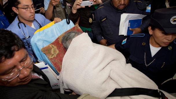 Ríos Montt había llegado en una camilla a la sala del tribunal para ser juzgado por genocidio y delitos contra la humanidad. Acompañado de paramédicos y de su hija, la exdiputada Zury Ríos, se le veía pálido y estaba ataviado con un pijama.