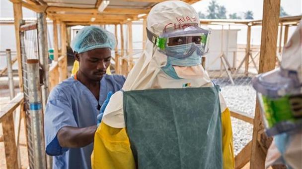 Un empleado sanitario prepara la ropa protectora de un colega antes de ingresar a una zona de alto riesgo en una clínica para pacientes con ébola en Makeni, Sierra Leona, el 2 de marzo de 2015. (Foto AP/Michael Duff)