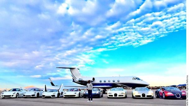 En esta ocasión, Mayweather posa junto con su jet privado, y su colección de autos, en la que figuran tres Bugatti Veyron, un Lamborghini Aventador, y dos Ferrari 458 Spider, todos con valor de miles de dólares.