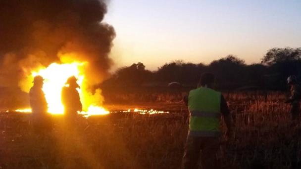 Miles de litros de gasolina se quemaron esta tarde al salirse de control una toma clandestina en un ducto de Petróleos Mexicanos que atraviesa la comunidad San Dieguillo, perteneciente al Municipio de Silao.