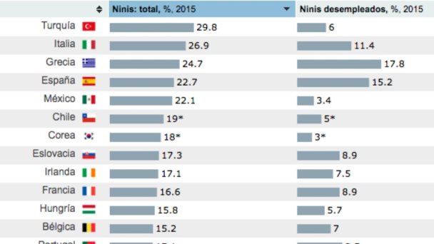 España es uno de los países de la OCDE con más jóvenes sin estudiar ni trabajar. El 22,7% de quienes tienen entre 15 y 29 años son ninis. Este porcentaje supera en casi ocho puntos la media del club de países industrializados, según un estudio de la misma organización que calcula que en total hay 40 millones de jóvenes en esta situación. Solo hay tres países, todos de la ribera mediterránea, con un porcentaje superior: Turquía, donde la situación afecta al 29,8% del colectivo, Grecia (26,9%) e Italia (24,7%).