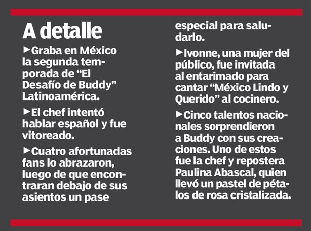 Esta conexión con sus fans quedó demostrada cuando a las 11:41 horas horas de ayer Buddy apareció en el escenario y 5 mil personas, según organizadores, se pusieron de pie y corearon su nombre, llevando al chef al borde de las lágrimas.