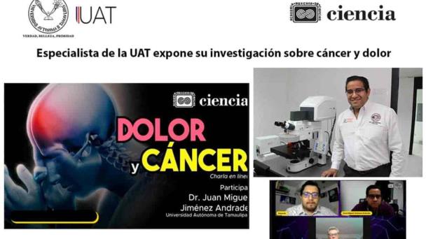 Cd. Victoria, Tam.- El Dr. Juan Miguel Jiménez Andrade, profesor e investigador de la Universidad Autónoma de Tamaulipas (UAT), impartió la conferencia “Dolor y cáncer”, llevada a cabo en el marco de la serie de sesiones “Charlas con autores” que promueve la Academia Mexicana de Ciencias (AMC).