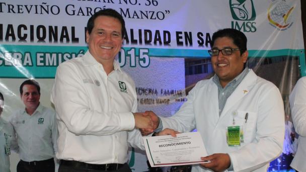 Trabajadores, directivos y operativos de la Unidad de Medicina Familiar (UMF) N.° 36 del Instituto Mexicano del Seguro Social (IMSS) en Matamoros, recibieron sendos reconocimientos por haber obtenido el Premio Nacional de Calidad en Salud 2015, en el concurso que celebra la Secretaría de Salud a nivel federal, para elegir a la unidad mejor calificada por la alta calidad en la prestación de los servicios médicos.