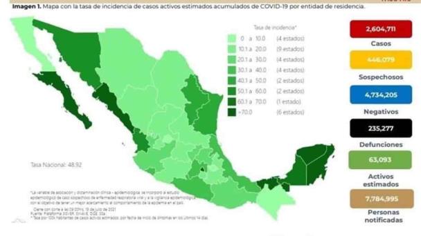 Estimó que del total de casos, hay 63 mil 93 activos, es decir, aquellas personas que presentaron síntomas en los últimos 14 días y pueden ser contagiosas.