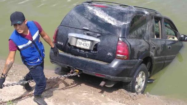 Lugareños divisaron una camioneta Buick Trainer color azul marino con placas de Texas, la cual había emergido del caudal, por lo que dieron parte a los cuerpos de rescate.