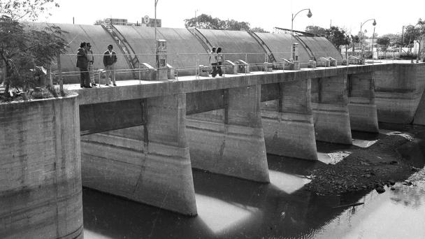 Compuertas sobre el canal Anzaldúas, retiradas en 1977, que permitían la canalización de las aguas del canal Anzaldúas a través del dren de las Mujeres hacia el río Bravo y por el dren Reynosa Poniente para el canal Rhode. En la foto el presidente municipal, Romeo Flores Salinas, supervisando las tareas de retiro de las compuertas de fierro y la modificación de los pilotes para construir el puente número tres, actualmente carril de venida del centro de la ciudad