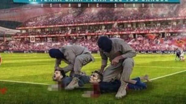 La imagen de un estadio visiblemente atiborrado y con jugadores sobre la cancha en un segundo plano, muestra a dos presuntos milicianos de ISIS sujetando las cabezas cercenadas de los astros del Real Madrid y del Barcelona que se disputan la etiqueta del mejor futbolista del momento.
