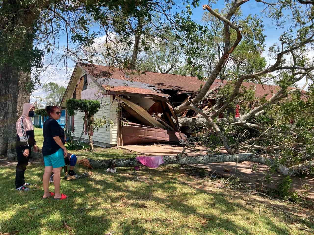 María Ramírez y su hijo José Ávila, de 17 años, en Orange, examinan los daños después de que una parte del gran árbol en su jardín delantero fue derribado por el ciclón.