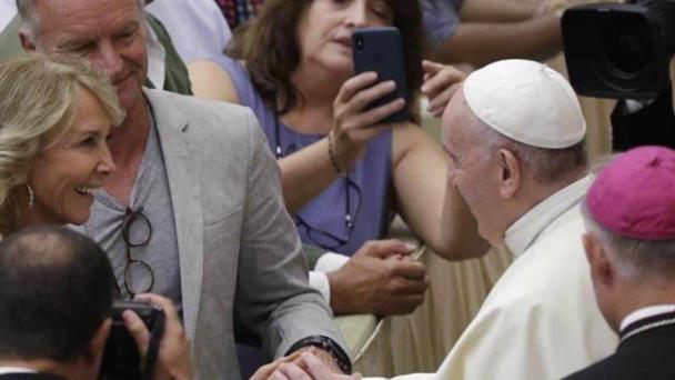 El encuentro se produjo en el Aula Pablo VI, cuando el Pontífice, después de su tradicional catequesis, se aproximó a la primera fila para saludar al músico, vestido con saco y camiseta grises, y a su mujer, enteramente de negro.