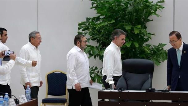 El anuncio fue hecho por los delegados de los países garantes, Cuba y Noruega, en presencia de Santos, el máximo jefe de las FARC, Rodrigo Londoño o Timochenko, y el secretario general de Naciones Unidas Ban Ki-moon, entre otras personalidades.