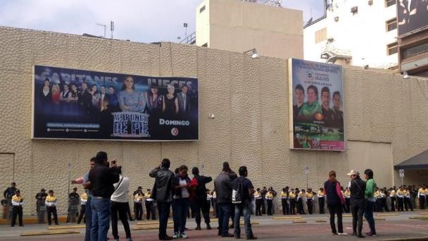 Decenas de profesores se reúnen en las banquetas aledañas a las instalaciones de Televisa Chapultepec; elementos de Seguridad Pública del DF resguardan el inmueble. Foto: Arcelia Maya