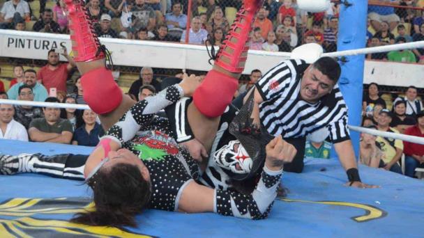 ESPALDAS PLANAS. La Parka sometió a La Pimpinela para que los técnicos salieran con el triunfo en la lucha estelar, ante una Arena Coliseo a reventar.