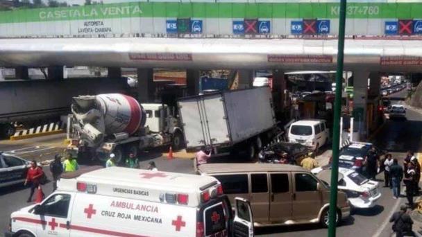 Cd. de México.- Luego de quedarse sin frenos, un tráiler chocó contra la fila de autos que esperaban cruzar la caseta de cobro de la Autopista Champa-La Venta, a la altura de Huixquilucan.