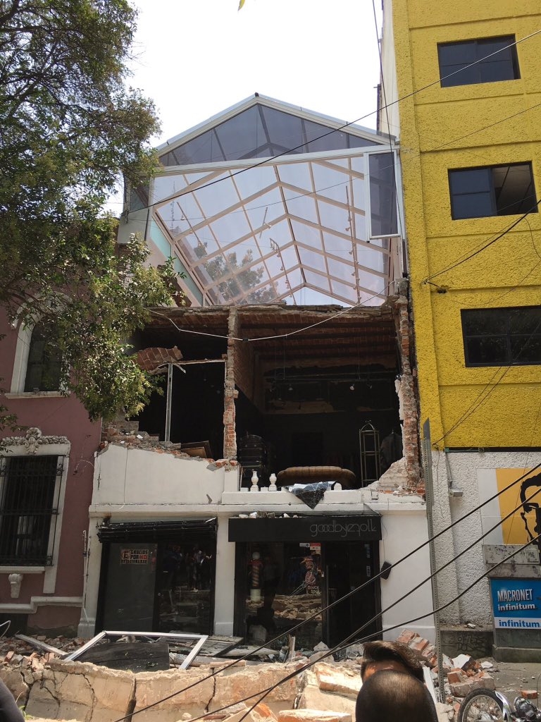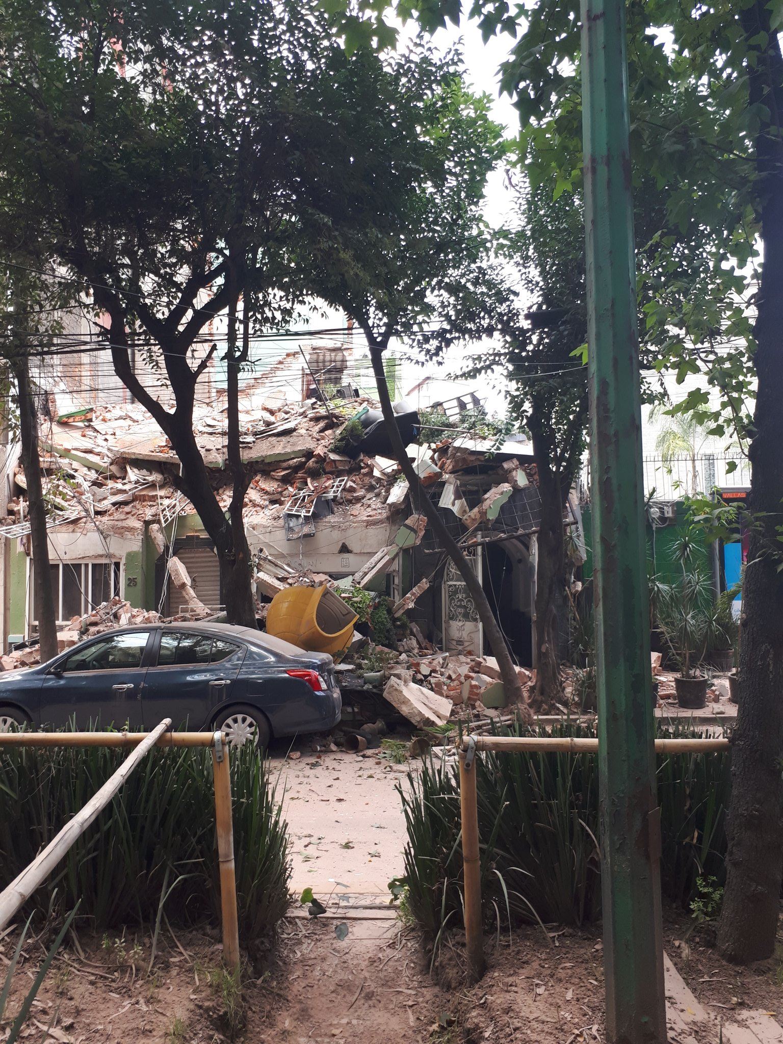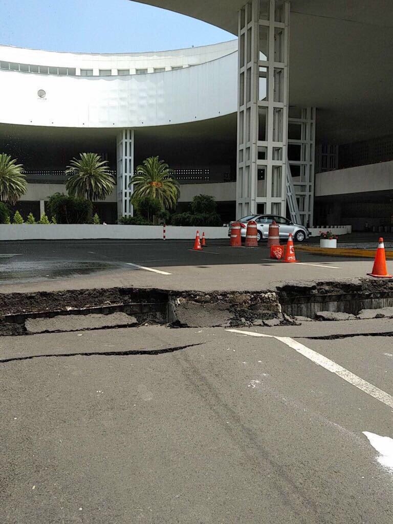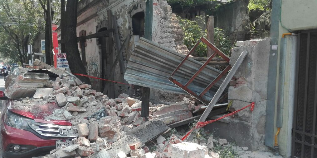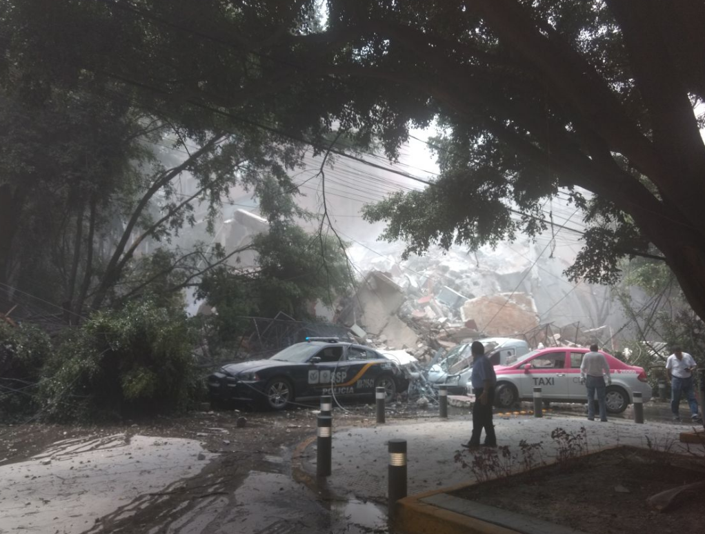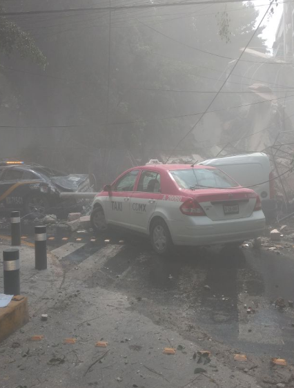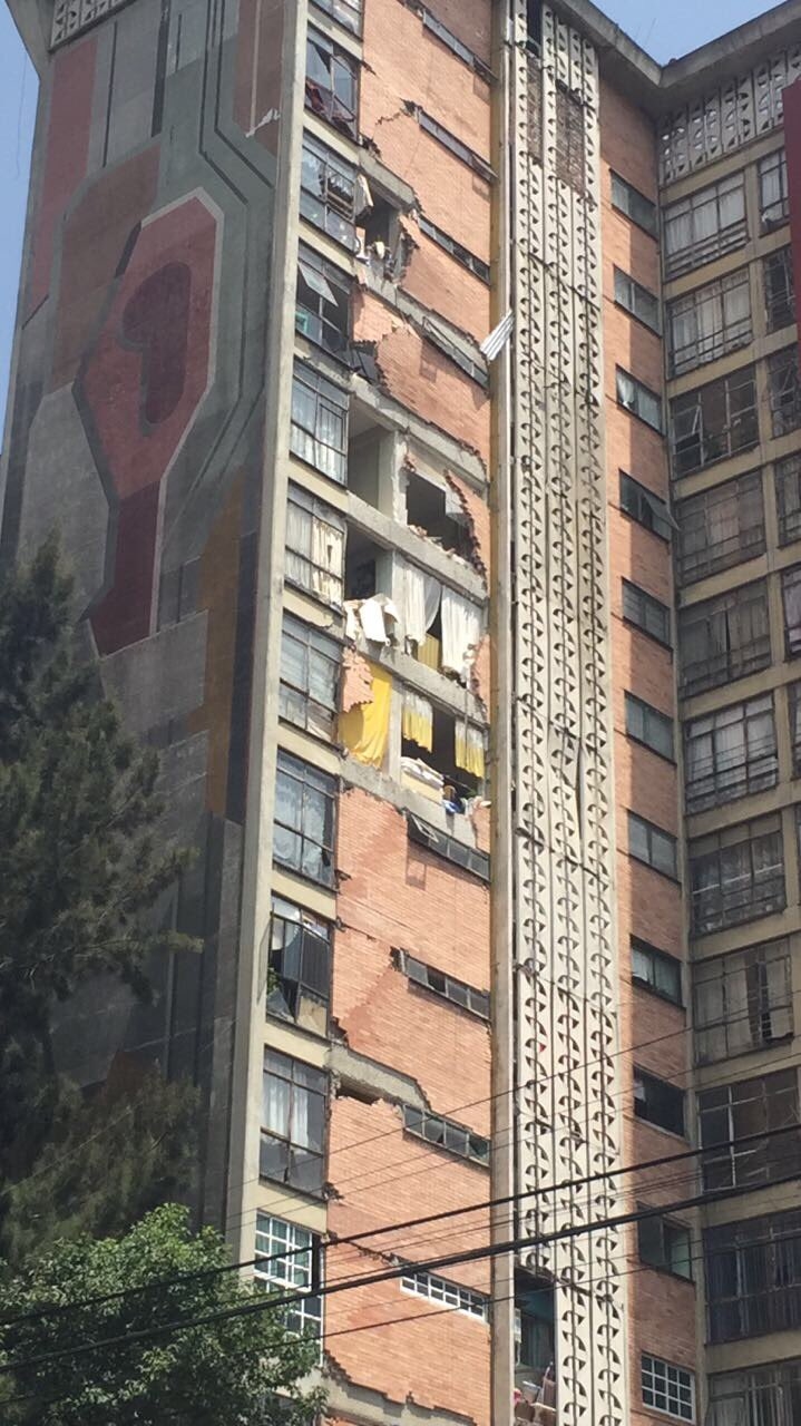 Un edificio de aproximadamente cinco pisos registró derrumbes sobre la esquina de Viaducto Miguel Alemán con Torreón, al sur de esta capital, luego del sismo de la tarde de este martes.