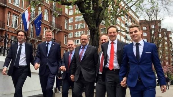 Alexander Pechtold, líder del Partido Demócrata Liberal D66, y Wouter Koolmees, también miembro del partido, realizaron el gesto en solidaridad con la comunidad homosexual.