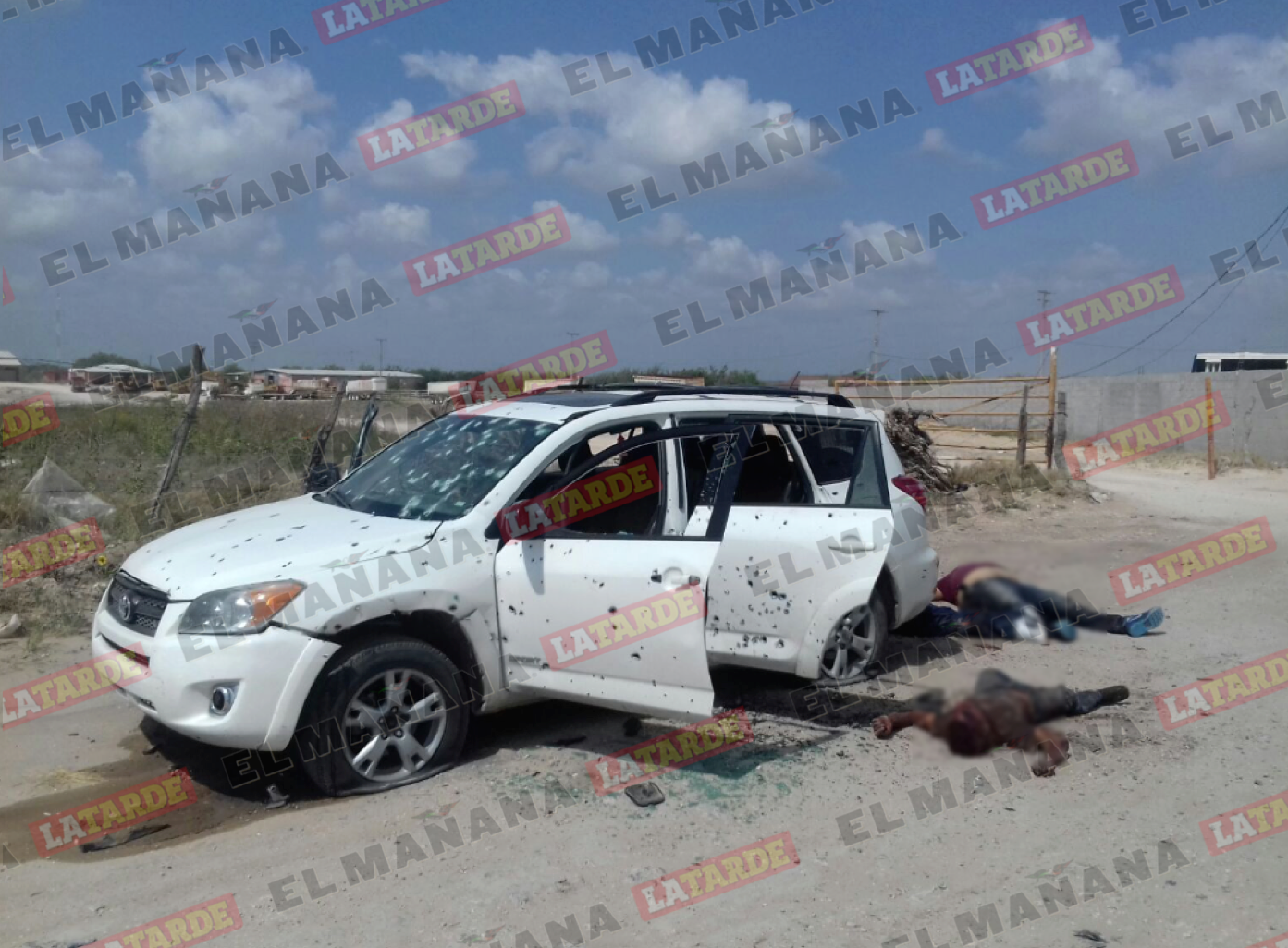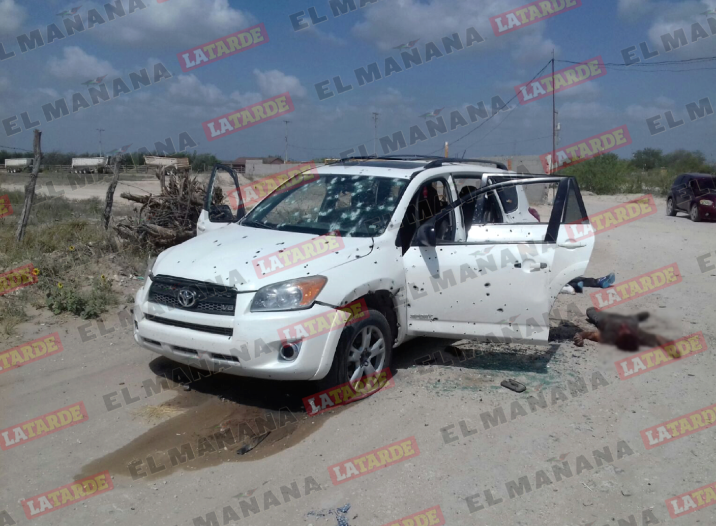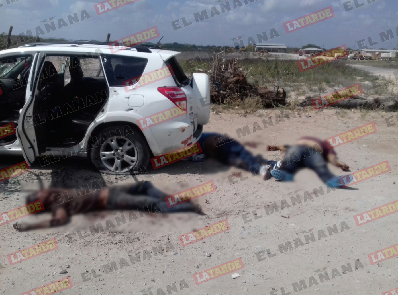 Antes del arribo de las autoridades, reporteros de EL MAÑANA observaron que los tres cadáveres quedaron sobre la calle de terracería, a un costado de la camioneta Toyota RAV4 con placas de Texas que tripulaban y que quedó con las puertas abiertas y devastada por decenas de proyectiles de alto poder que impactaron la carrocería.